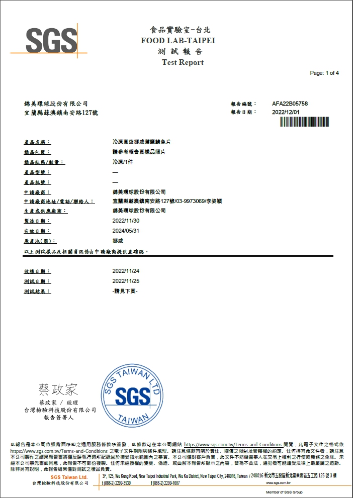 真空挪威薄鹽鯖魚片-檢驗報告p.1